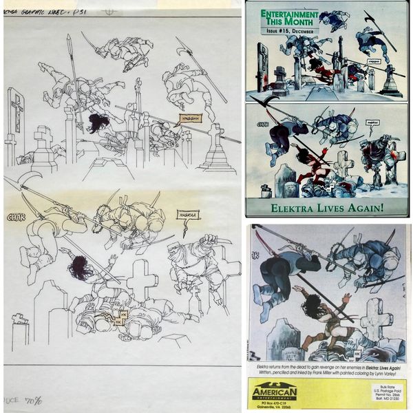 In short, this is one of the most important pieces of original comic book art Holy Grail Collectibles has ever had the pleasure to own. This iconic masterpiece from "Hunt the Dark Knight" has an image area of roughly 12" x 18", and aside from the typical four tape residue stains in the borders, some passages of white-out, and glue staining in panel three where an art correction stat had been glued over the original art (now revealed), the art is in Very Good condition. The original removed art stat is also included with the lot.